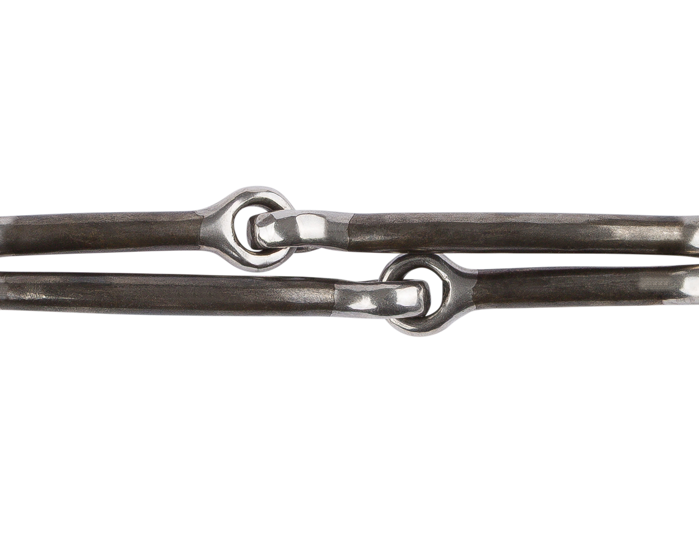 The Barrie mouthpiece features two jointed sections with offset center links, creating a double nutcracker action that increases pressure on the tongue and bars compared to a traditional double-jointed bit. This design provides a more defined response without the added sharpness of twisted mouthpieces.